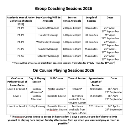 Opportunities to engage in our weekly On The Course Playing sessions are also available and are key to the young golfer’s development in the game. The playing sessions will be grouped based on ability and players will use our On Course Pathway to track their progression. Attending both group coaching and playing sessions is advised and the provisional schedule for 2026 is shown below.