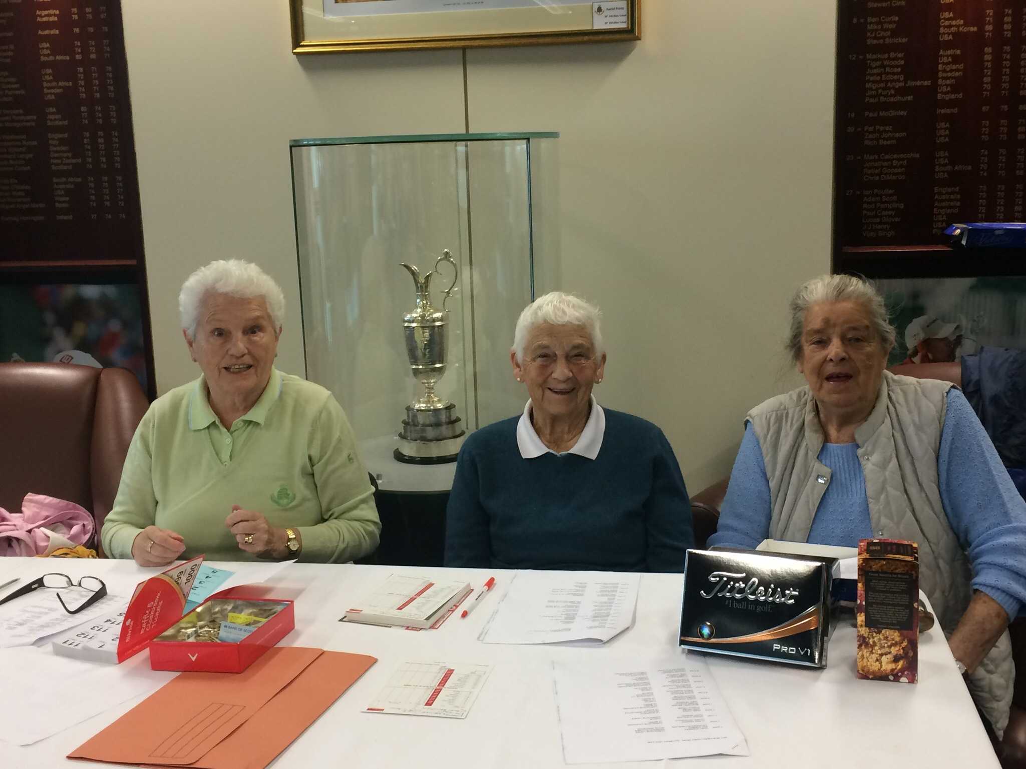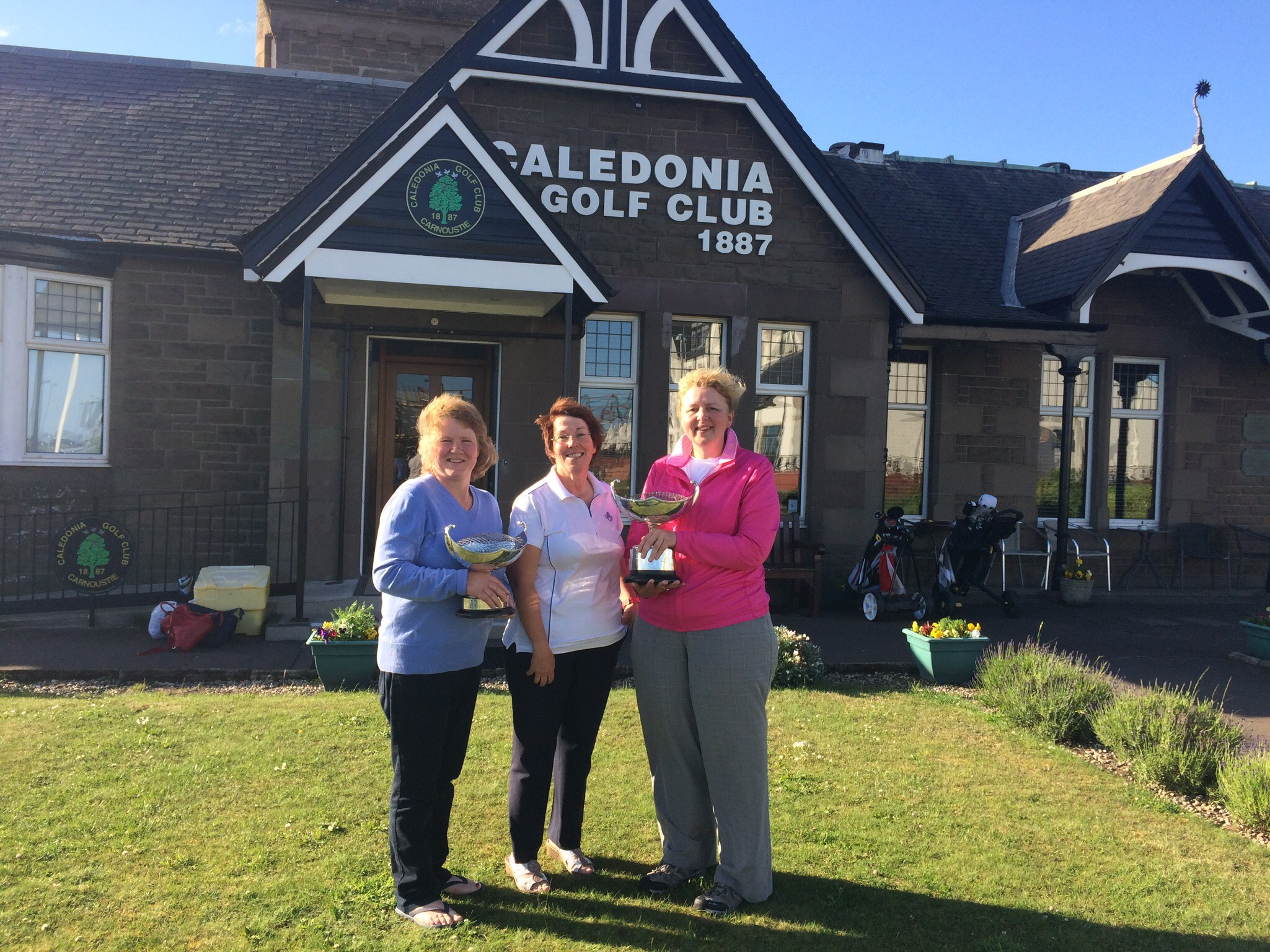 - Gourlay Rosebowl winner Jane Grubb with Carnoustie Rosebowl winner Karen Marshall and CGLMC chairman Pat Sawers